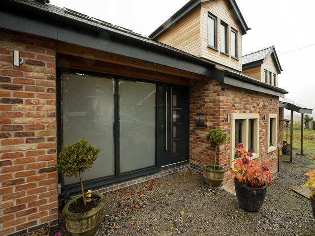 After buying an old bungalow that had seen better days in a stunning location within Lymm, Cheshire with magnificent views across the countryside they had decided to make the best use of the plot and knock down the existing structure and build a brand new property. Going for a semi traditional build with some modern twists such as the grey aluminium windows and wood cladding. The entrance door to the property is one of our highly secure aluminium doors with 9 point locking and metal construction achieving great thermal properties.