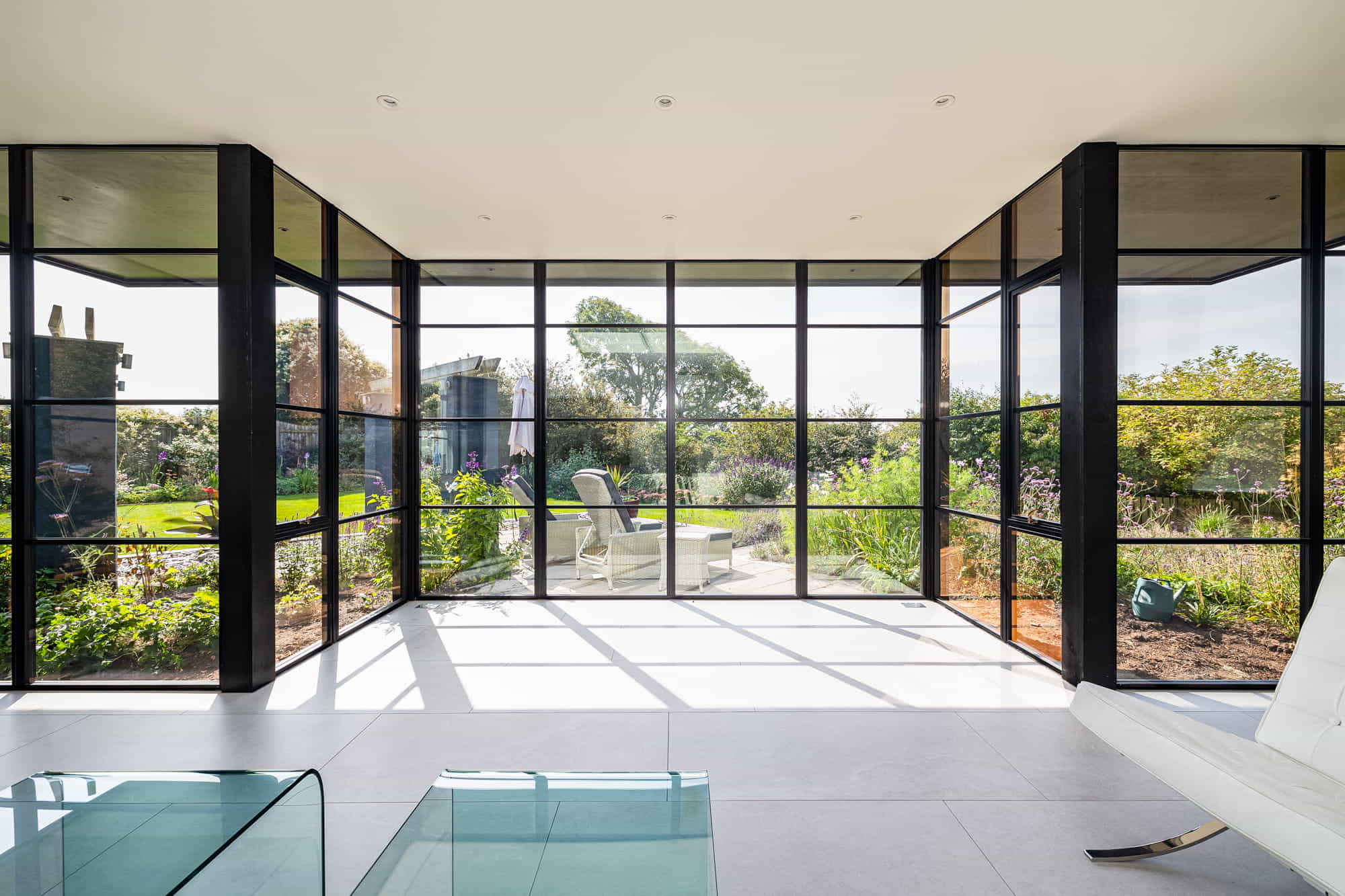 The roof is supported via several thin steel columns that have been wrapped in a black cladding to tie in with the screens. Both ends of the room have a set of French doors installed to allow access to the large garden at either end.