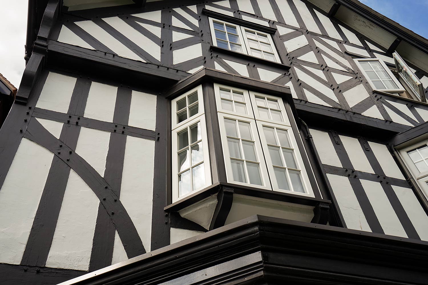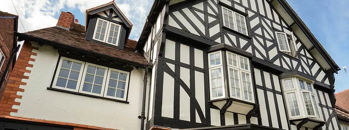 The Evolution windows and door range has been specifically developed for this type of property, with many features designed into the window to imitate the look of timber without the need for the regular re-painting required by timber windows. Some of the standout features on these windows include traditional butt joints, astragal glazing bars, black wood-grain frame with white wood-grain casements, slimline frame to match timber, cast iron monkey tail handles, and peg stays.