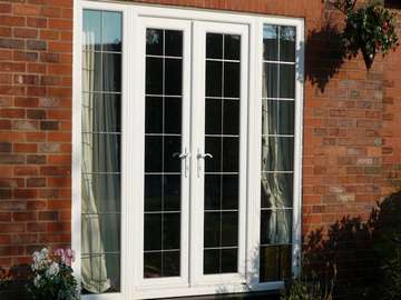 HOLYWELL , NORTH WALES : 2800 White PvcU French doors - Triple glazed - Antigue lead panels U Value .95 pvcu bi folding doors north wales